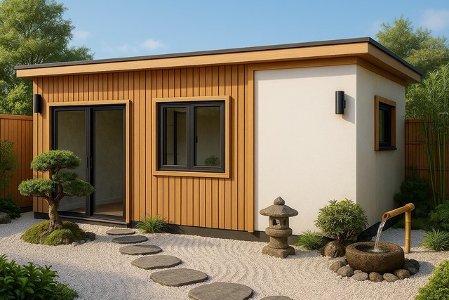 – ผนังกรุระแนงไม้ พื้นกระเบื้องยาง